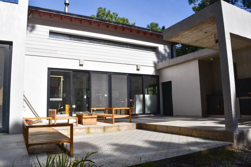 Esta moderna casa de una planta se encuentra ubicada en una zona arbolada y tranquila de Pinamar Norte, sobre la Avenida Enrique Shaw y Hudson. Con una superficie total construida de 212 m², distribuidos en 189 m² cubiertos y 23 m² semicubiertos, la propiedad se emplaza sobre un lote de 1016 m².